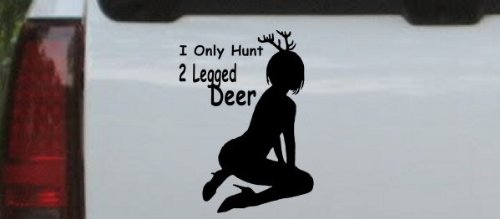 I Only Hunt 2 Legged Deer Funny Car Window Wall Laptop Decal Sticker Black 30in X 22.5in If this item does not show as SHIPS FROM AND SOLD BY RAD DEZIGNS it is a COUNTERFEIT product. When making your color choice please be aware that our decals do not have a background or background color at all. These are decals not stickers. . When applied all you will see is the outline as shown in the images. If the decal will be going on glass you will want to use a bright color like white, yellow or pink. Black and other dark colors will not show up well on glass. Our decals are die cut from solid 2.8mil vinyl. The vinyl is rated at 5yrs outdoors. Our decals can withstand cold, hot and wet weather with no problem. If you are using the decal inside they will pretty much last as long as you want them. The decals can be removed from any surface but cannot be reused once removed. If applied to a painted surface such as a wall or auto body the paint may come off with the decal when removi ng it. Our decals can be applied to any smooth flat surface including car, truck, van and suv windows. Our decals can also be used on the body or hoods of automobiles like sports cars, race cars and trucks. You can even use our decals on your motor home or camper. Our decals can also be used for wall art. You can apply any of our decals to the walls in your home, office or garage to add whimsical art. You can also use our decals to personalize your laptop or books. Our decals make great laptop skins. Other places you could use our decals include - horse trailers, kayaks, boats, vans, motorcycles, ATVs, snowboards, snowmobiles, surfboards, RVs, helmets, glass doors, gun cabinets, mirrors, walls, mailboxes, picture frames, tool boxes, painted wood, aluminum, plastics, fiberglass etc...